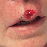 Patient with a history of Well-Differentiated Squamous Cell Carcinoma, Ulcerated and Impetiginized, to the Left Inferior Vermillion. The patient underwent Mohs surgery in three stages with Rotation Flap repair.